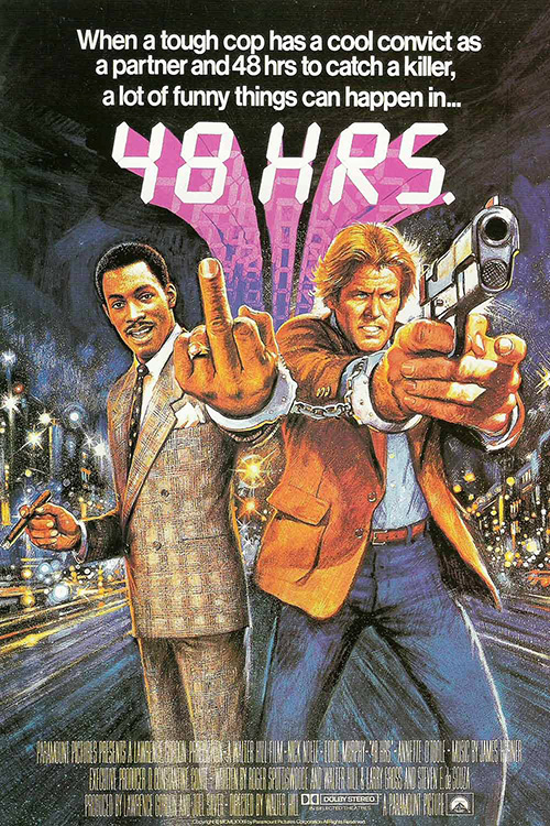 Oddball cop and tough guy, Jack Cates is the only survivor of a cop shooting and in hunting down the murderer collects Reggie Hammond from jail for 48 hours. Hammond is oddly motivated to help. The killer is searching for his stash of cash. Cates and Hammond who have the Black-white, cop-crook thing to work out make surprisingly good partners as they navigate through the city looking for their suspect.