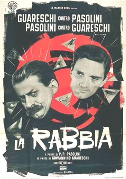 "La Rabbia" employs documentary footage (from the 1950s) and accompanying commentary to attempt to answer the existential question, Why are our lives characterized by discontent, anguish, and fear? The film is in two completely separate parts, and the directors of these respective sections, left-wing Pier Paolo Pasolini and conservative Giovanni Guareschi, offer the viewer contrasting analyses of and prescriptions for modern society. Part I, by Pasolini, is a denunciation of the offenses of Western culture, particularly those against colonized Africa. It is at the same time a chronicle of the liberation and independence of the former African colonies, portraying these peoples as the new protagonists of the world stage, holding up Marxism as their "salvation," and suggesting that their "innocent ferocity" will be the new religion of the era. Guareschi's part, by contrast, constitutes a defense of Western civilization and a word of hope, couched in traditional Christian terms, for man's future.