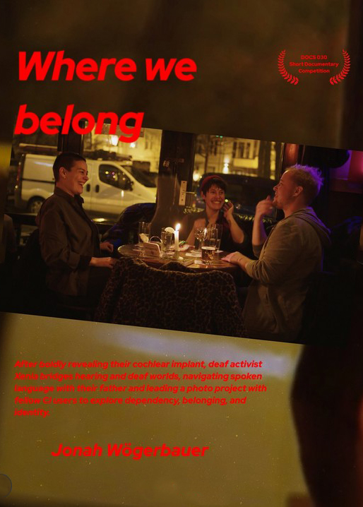 Xenia contemplates her freshly shaved head in the mirror. She is showing her Cochlea-Implant openly - a step that required a lot of courage. As a deaf activist raised in a hearing environment, she wants to build bridges between both worlds. Although she feels most at home within the deaf community and using sign language, she must resort to spoken language to communicate with her father. Through a photo project, Xenia initiates a dialogue with other CI-users, together they explore questions of dependency and belonging between the worlds.