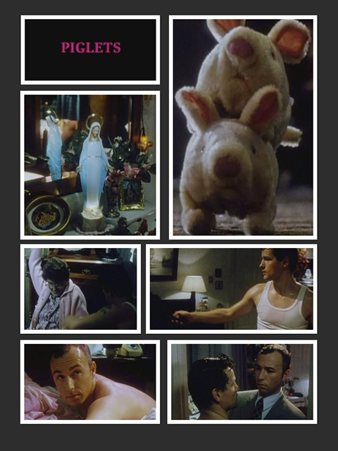 In a bedroom watched over by a statue of the Blessed Virgin Mary, a young man in naught but a jock strap is handcuffed to bed while his host sodomizes him. It's coitus interruptus as the host's granny, in the next room, does everything in her wheelchair-bound power to stop the action: first with the noise of the radio, then with a power drill, and then her cell phone. Her grandson is equally determined to stop her and get back to the stupping, going so far as to removing the handcuffs from his date and using them on granny. How long will can they keep this up before someone bends? And who are the piglets?