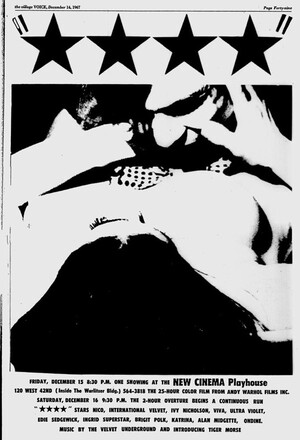 Reel Titles: Group One (30 mins.) Sunset Beach on Long Island (30 mins.) High Ashbury (segment 76) (30 mins.) Tiger Morse (filmed Nov. 66) (with Ultra Violet, Ondine, Nico) (20 mins.) International Velvet (filmed Jan. 67) (30 mins.) Allen and Dickin (filmed 1967) (with Allen Midgette and Dicken) (2 hrs.) Imitation of Christ (8hrs.) Courtroom> (filmed Dec. 66) (30 mins.) Gerard Has His Hair Removed with Nair (filmed July 67) (30 mins.) Katrina Dead (segment 23) (30 mins.) Sausalito (30 mins.) Allen and Apple (filmed late January 67) (With Allen Midgette) (30 mins.) Ondine and Ingrid (segment 68) (30 mins.) Ivy and Susan (30 mins.) Sunset in California (30 mins.) Ondine in Yellow Hair (30 mins.) Philadelphia Story (30 mins.) Katrina (segment 25) (30 mins.) Barbara and Ivy (30 mins.) Ondine and Edie (30 mins.) Susan and David (segment 82) (30 mins.) Orion (segment 42) (with Billy Name) (30 mins.) Emanuel (segment 35) (30 mins.) Rolando (segment 37) (30 mins.) Easthampton Beach (segment 43) (30 mins.) Swimming Pool (30 mins.) Nico-Katrina (also listed as segment 43) (30 mins.) Tally and Ondine (30 mins.) Ondine in Bathroom (30 mins.).